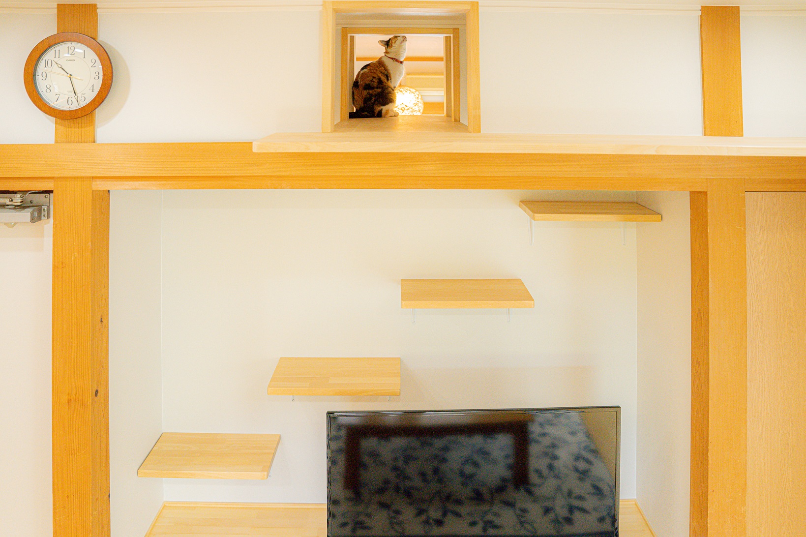 リビングをグルリと1周したキャットウォーク、PCデスクや飾り棚からも昇り降りできます。