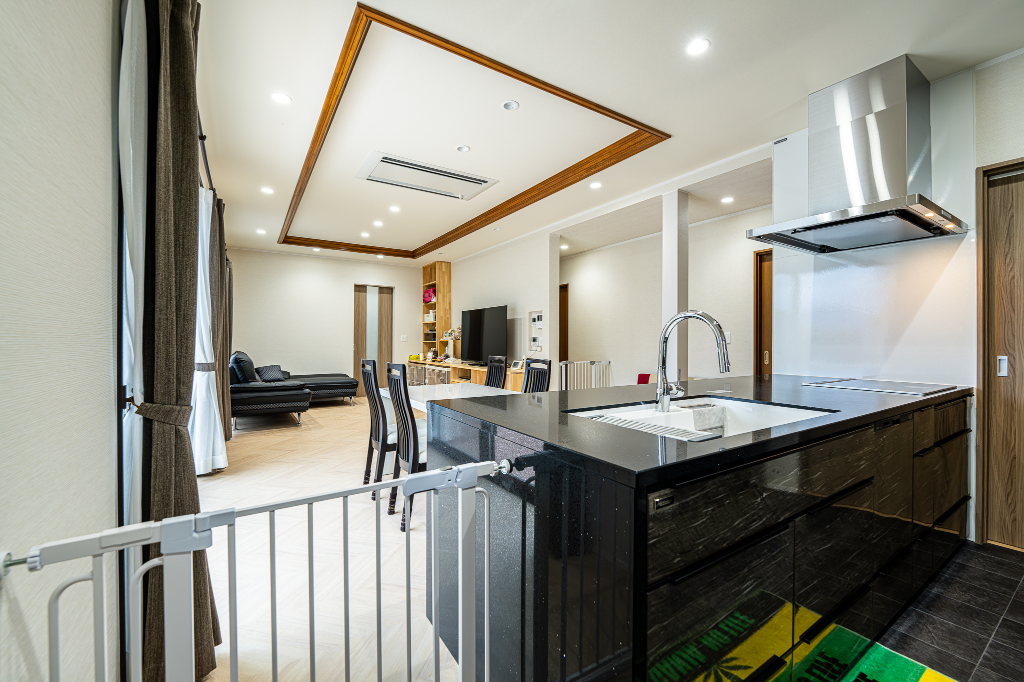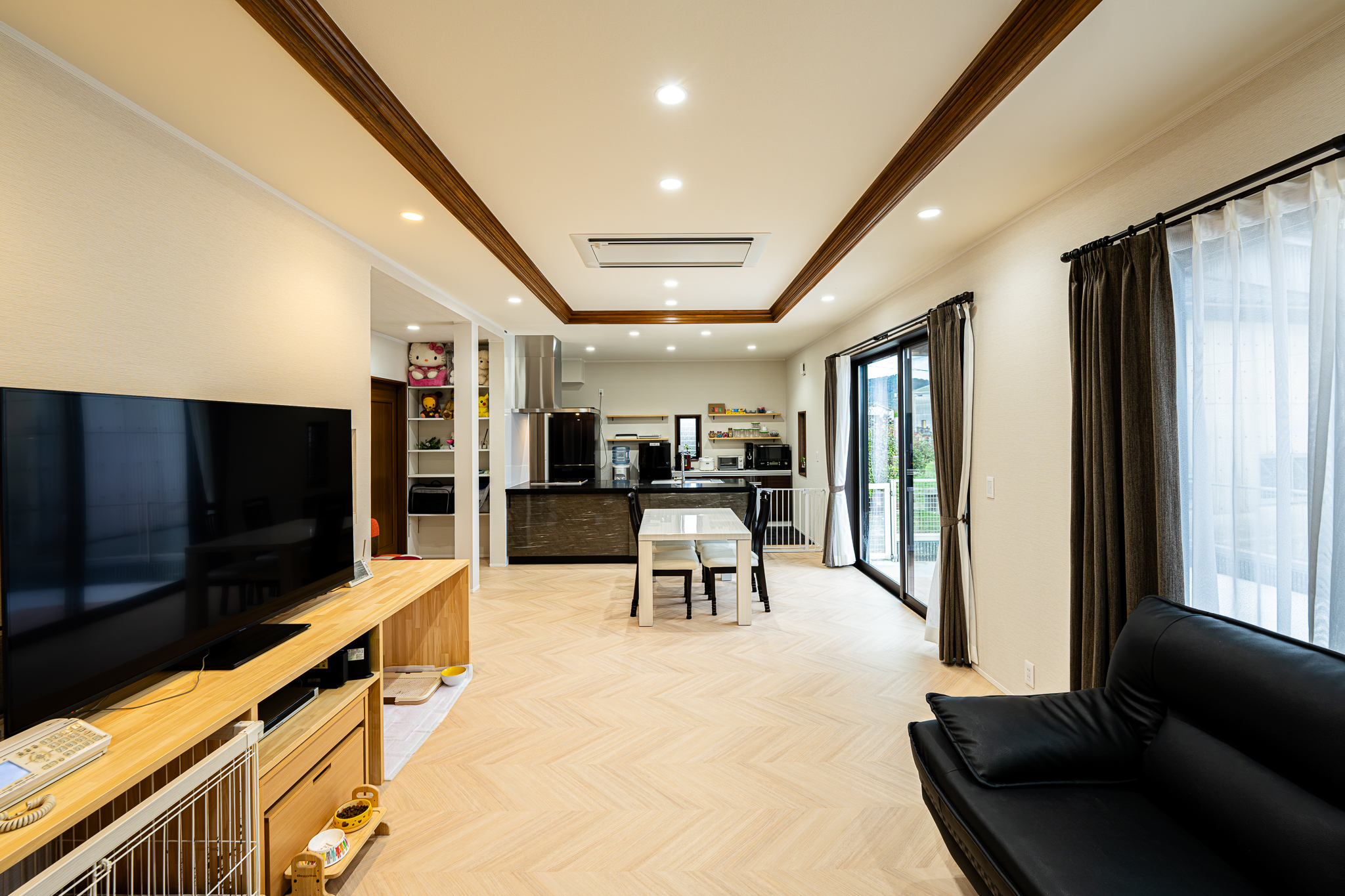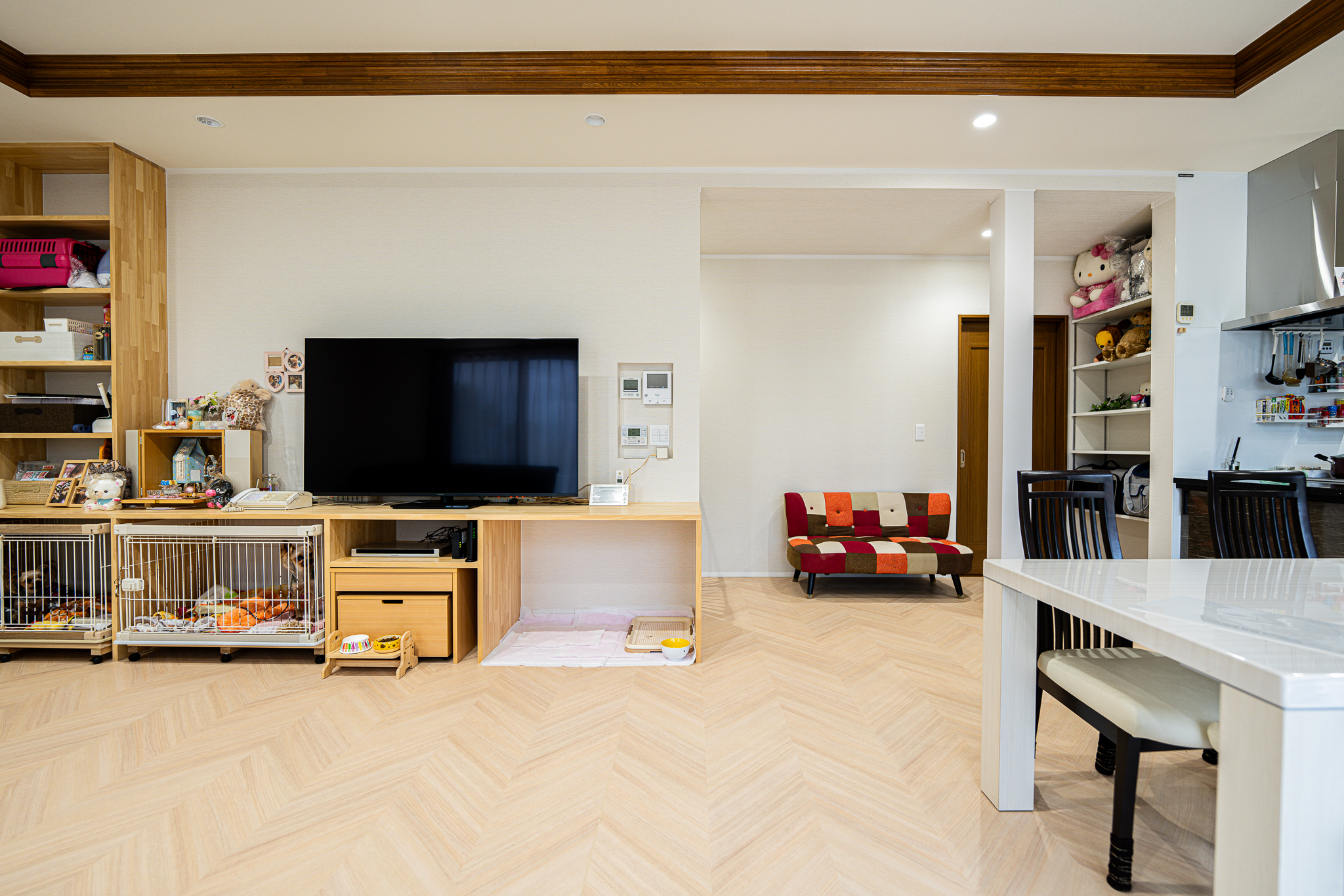 元から広かったリビングをワンちゃん達が走り回れる様に廊下を取り込んで更に大空間にしました。ワンちゃん達のことを1番に考えて、床はクッション性のある素材で仕上げました。